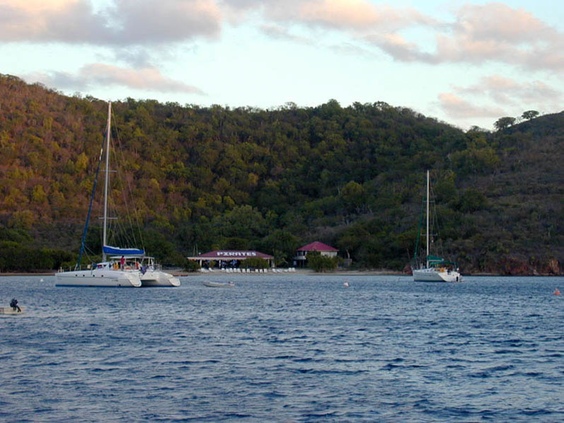 Norman Island, supposedly the model for "Treasure Island", is packed with charter boats. It has a couple of restaurants and absolutely fabulouos snorkeling.