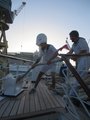 Some things don't change that much at sea. Acres of teak and mahogany to be varnished and brass to be polished and constant maintenance of the boat. Some things do. Electric winches and windlasses mean the sailing can be done by far fewer crew. In fact, the biggest part of the Royal Clipper's crew is given over to running what is really a small luxury hotel. The laundry runs 24x7 and the cooks are up baking bread and waiters setting out coffee and croissants by 6 am. As with any ship, the passengers' thoughts and conversations often turn to the next meal when not given over to boats, the weather and the next port of call. Unlike on most cruise ships, there are no casinos and the entertainment home made. There were several small pools on the top deck in which one could sit and slosh to and fro as the boat rolled.